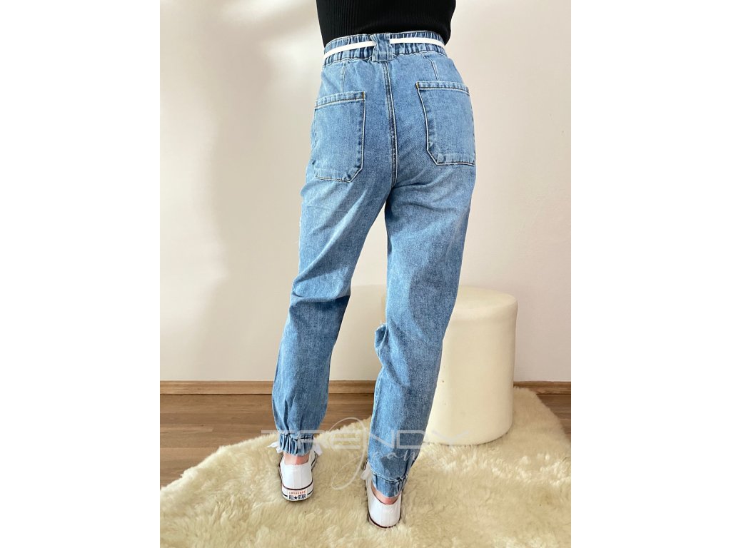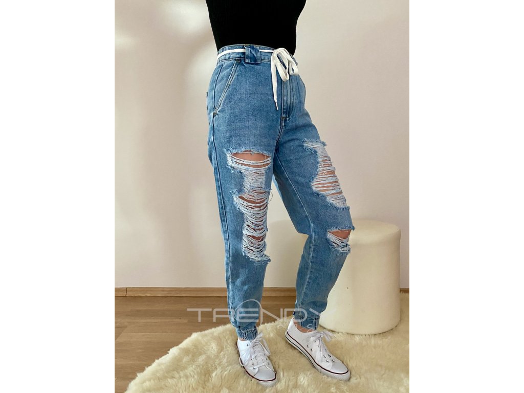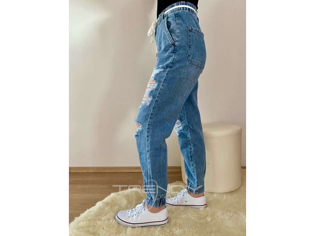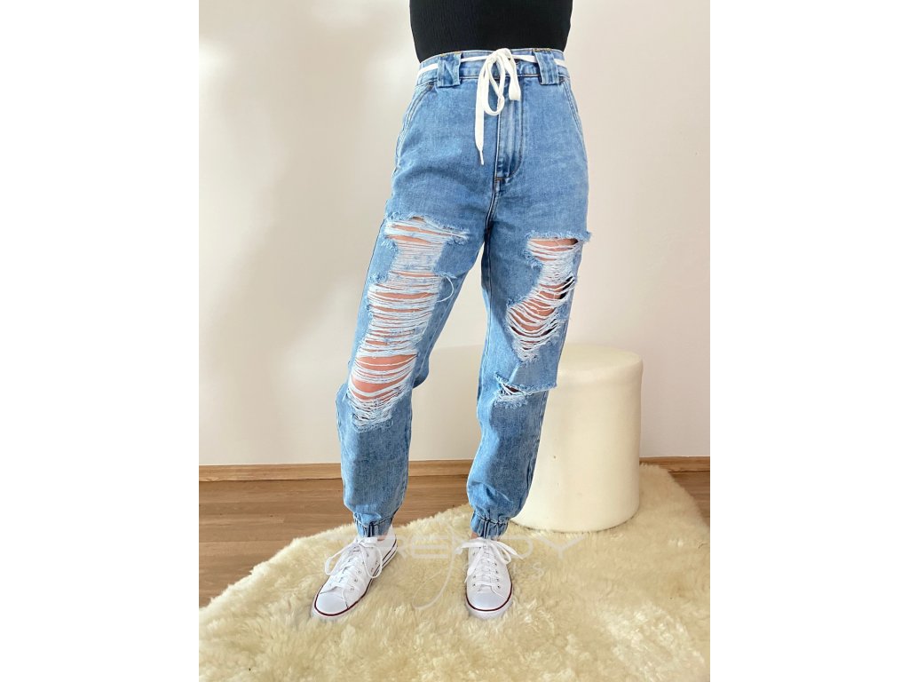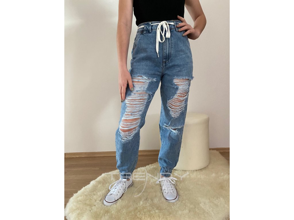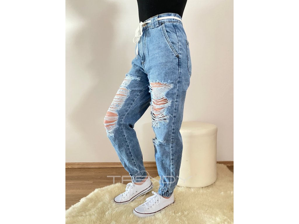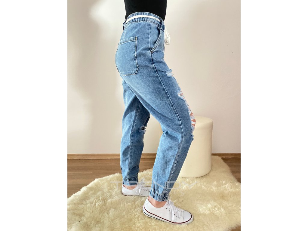 Modré trhané letní džíny v pase a na kotnících guma, nejsou elastické